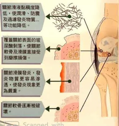 - 覆蓋關節表面的玻尿酸剝落,使關節軟骨及滑膜直接受到摩擦損傷。