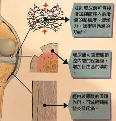 - 注射玻尿酸可直接增加關節腔內的滑液的粘稠度、潤滑力、緩衝與過濾的功能。
