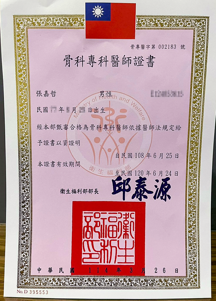 張嘉哲骨科專科醫師證書