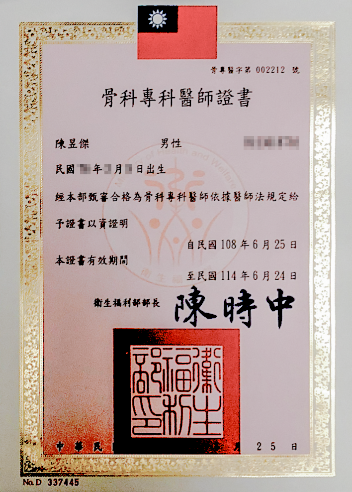陳昱傑骨科專科醫師證書